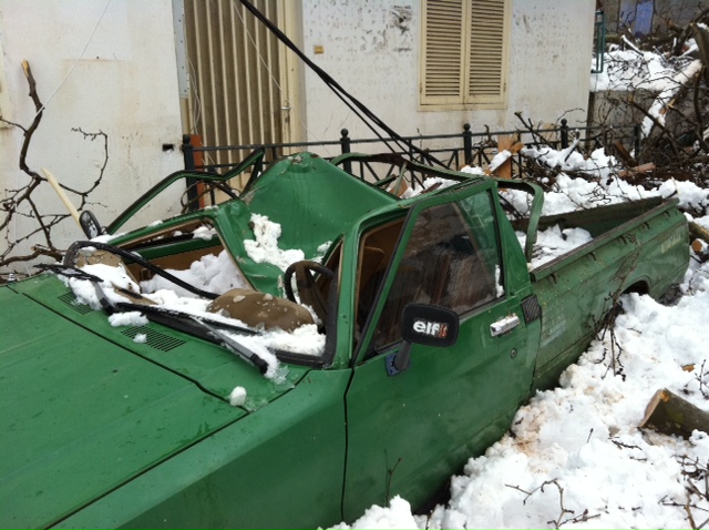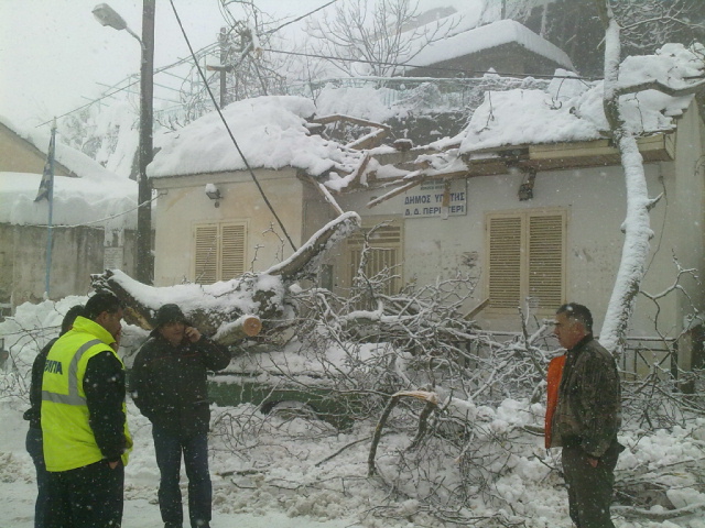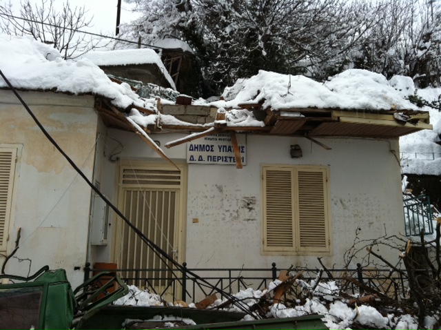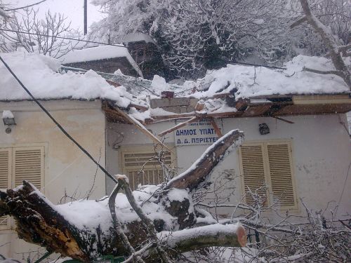 Η κάμερα του LR βρέθηκε στο Περιστέρι Υπάτης, όπου το πρωί τεράστιο κλωνάρι πλατάνου, από το βάρος του χιονιού... "προσγειώθηκε" στη στέγη του κοινοτικού γραφείου και καταπλάκωσε αυτοκίνητο.Στα χωριά της Υπάτης στο Περιστέρι και τον Πύργο το χιόνι έφτασε το ένα μέτρο. Ο Δήμος από το πρωί με μηχανήματα προσπαθούσε να ανοίξει το δρόμο και τα συνεργεία της ΔΕΗ να αποκαταστήσουν τη βλάβη στο δίκτυο, που είχε αφήσει τα χωριά της περιοχής χωρίς ρεύμα από χθες το βράδυ.