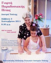 Ο Σύλλογος Γυναικών Λουτρών Υπάτης μας προσκαλεί στη γιορτή παραδοσιακής πίτας, που διοργανώνει για 6η συνεχή χρονιά, τo Σάββατο 3 Σεπτεμβρίου 2011 και ώρα 8.30 μ.μ. στο αθλητικό πάρκο των Λουτρών Υπάτης, στο γήπεδο τένις.